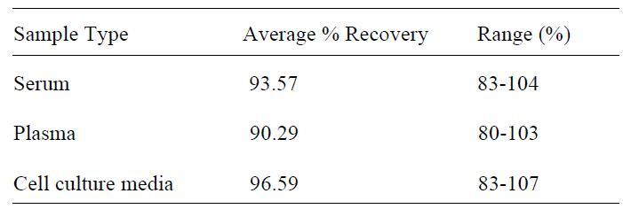 | Specificity | Cross Reactivity: This ELISA kit shows no cross-reactivity with any of the cytokines tested: Human Angiogenin, BDNF, BLC, ENA-78, FGF-4, IL-1 alpha, IL-1 beta, IL-2, IL-3, IL-4, IL-5, IL-6, IL-7, IL-8, IL-9, IL-11, IL-12 p70, IL-12 p40, IL-13, IL-15, I-309, IP-10, G-CSF, GM-CSF, IFN-gamma, Leptin (OB), MCP-1, MCP-2, MCP-3, MDC, MIP-1 alpha, MIP-1 beta, MIP-1 delta, PARC, PDGF, RANTES, SCF, TARC, TGF-beta, TIMP-1, TIMP-2, TNF-alpha, TNF-beta, TPO, VEGF. |