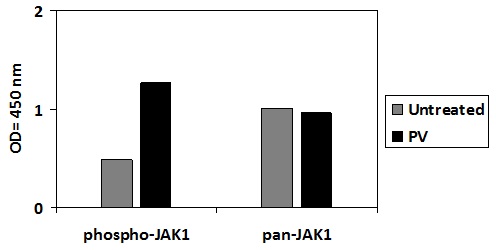 RayBio® Phospho- JAK1 (Y1022) ELISA kit is a very rapid, convenient and sensitive assay kit that can monitor the activation or function of important biological pathways in human, mouse and rat cell lysates. By determining phosphorylated JAK1 protein in your experimental model system, you can verify pathway activation in your cell lysates. You can simultaneously measure numerous different cell lysates without spending excess time and effort in performing a Western Blotting analysis.