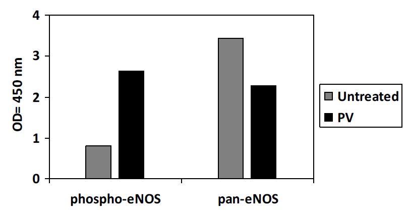 THP-1 cells were treated or untreated with PV (pervanadate). Cell lysates were analyzed using this phosphoELISA and Western Blot.