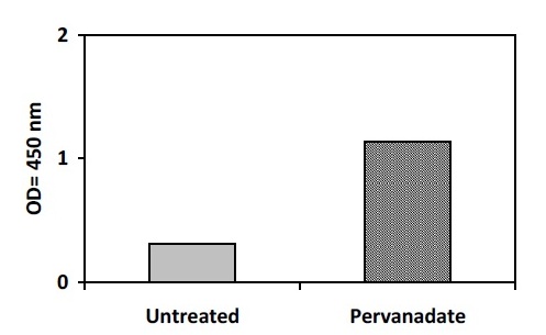JURKAT cells were treated or untreated with Pervanadate for 10 min at 37°C. Cell lysates were analyzed using this phosphoELISA: